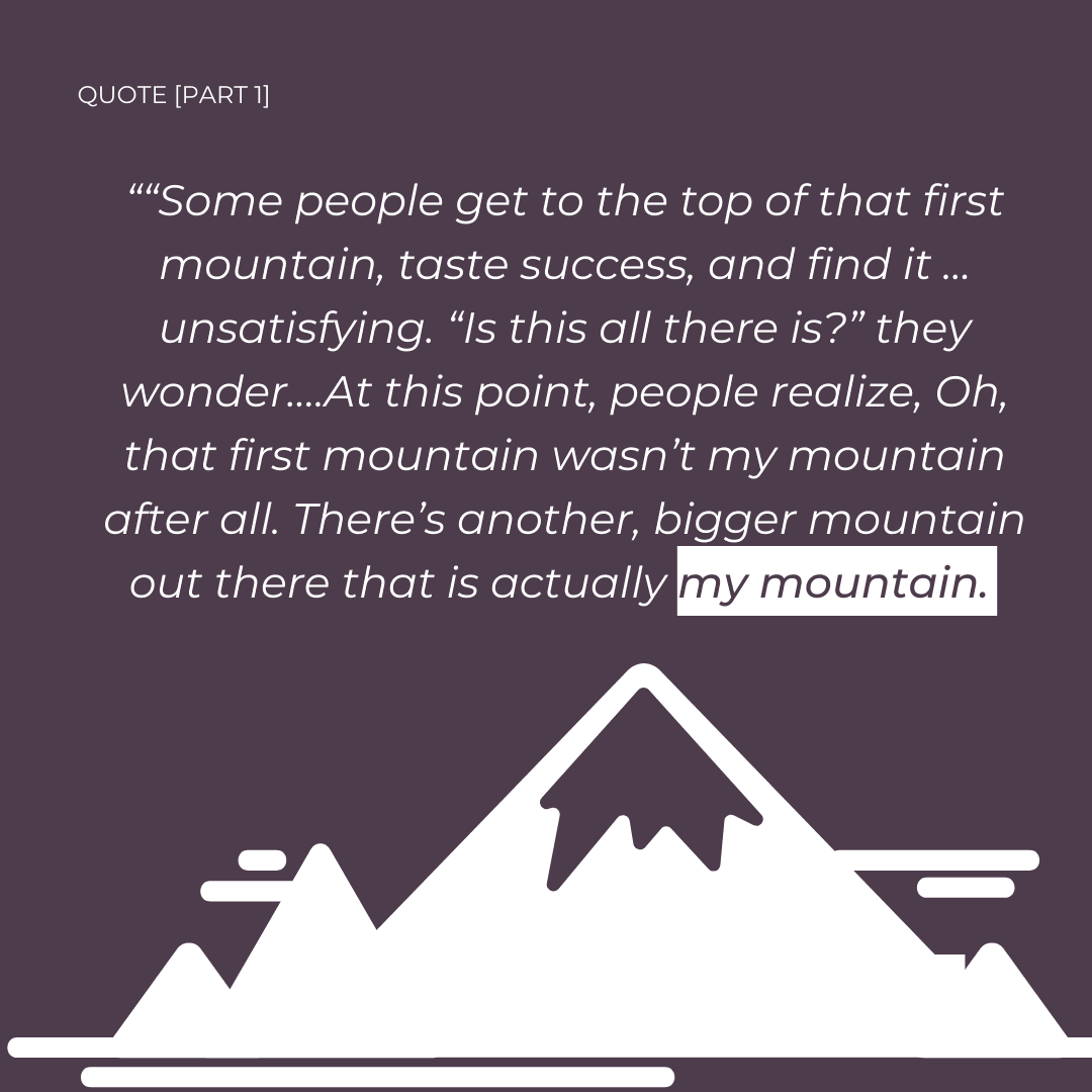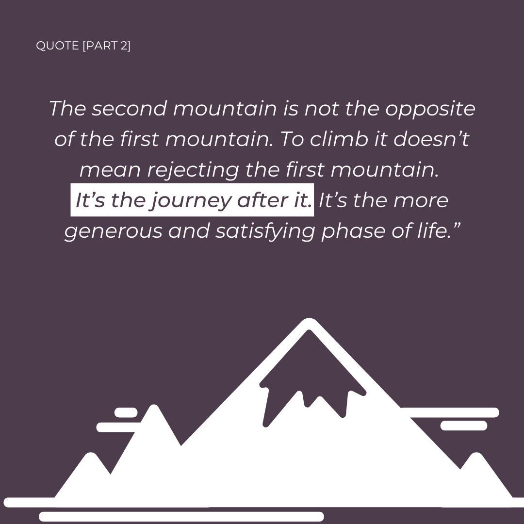 “Some people get to the top of that first mountain, taste success, and find it … unsatisfying. “Is this all there is?” they wonder…At this point, people realise, Oh, that first mountain wasn’t my mountain after all. There’s another, bigger mountain out there that is actually my mountain. The second mountain is not the opposite of the first mountain. To climb it doesn’t mean rejecting the first mountain. It’s the journey after it. It’s the more generous and satisfying phase of life.”